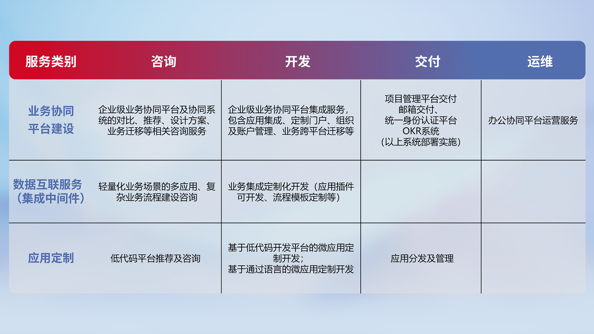 针对钉钉、、企微、、、IDaas等平台级产品提供产品的规划、、、、方案、、交付、、、、定制化开发等服务,,,实现如统一协同办公、、智能客户服务、、、混合会议管理、、、智能数据查询、、、、等业务场景,,实现数字化转型。。。